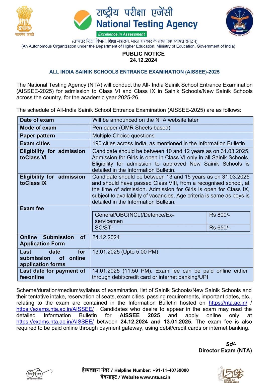SAINIK SCHOOL CLASS 6 & 9 ENTRANCE TEST NOTIFICATION