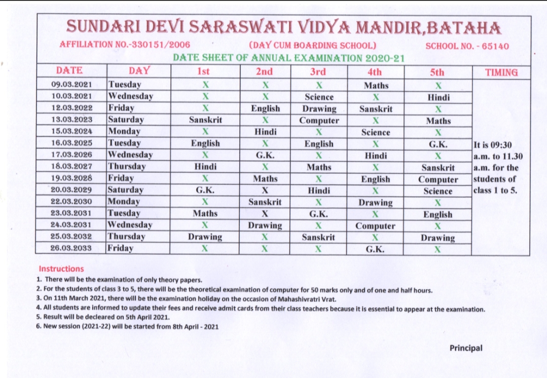 Annual Examination will be conducted on 09.03.2021 for session 2020-21 (Class 1 to V)