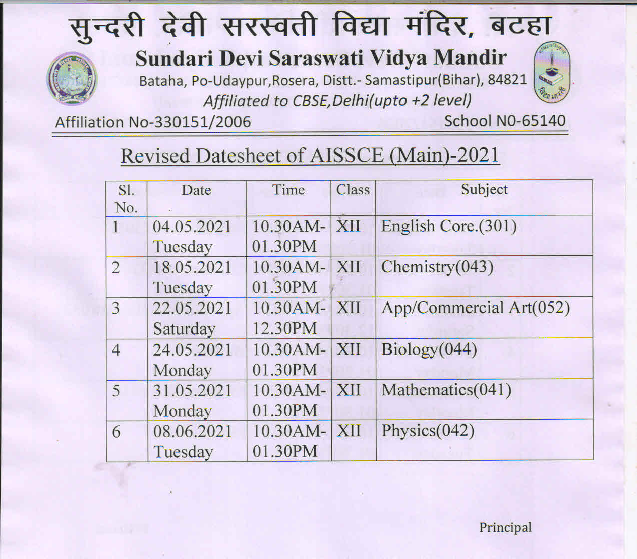 Revised Datesheet for CBSE Board Examinations for Class XII(2021)