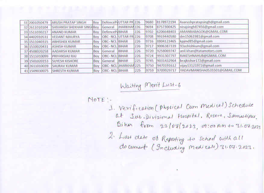 SDSVM Sainik School Admission-2023 Waiting Merit List-6 (Page -2) Medical test :22/07/2023 09:00 31/07/2023